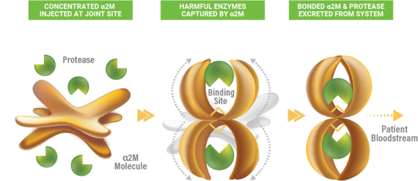 It is our body’s own defense mechanism. This special molecule works by binding to the enzymes (proteases) that degrade the cartilage cells and tissue. However, it is too big and complex to enter the joint or disc space in large enough quantities. As a result, it is necessary to inject additional concentrated A2M into the affected area to restore balance and relieve pain.